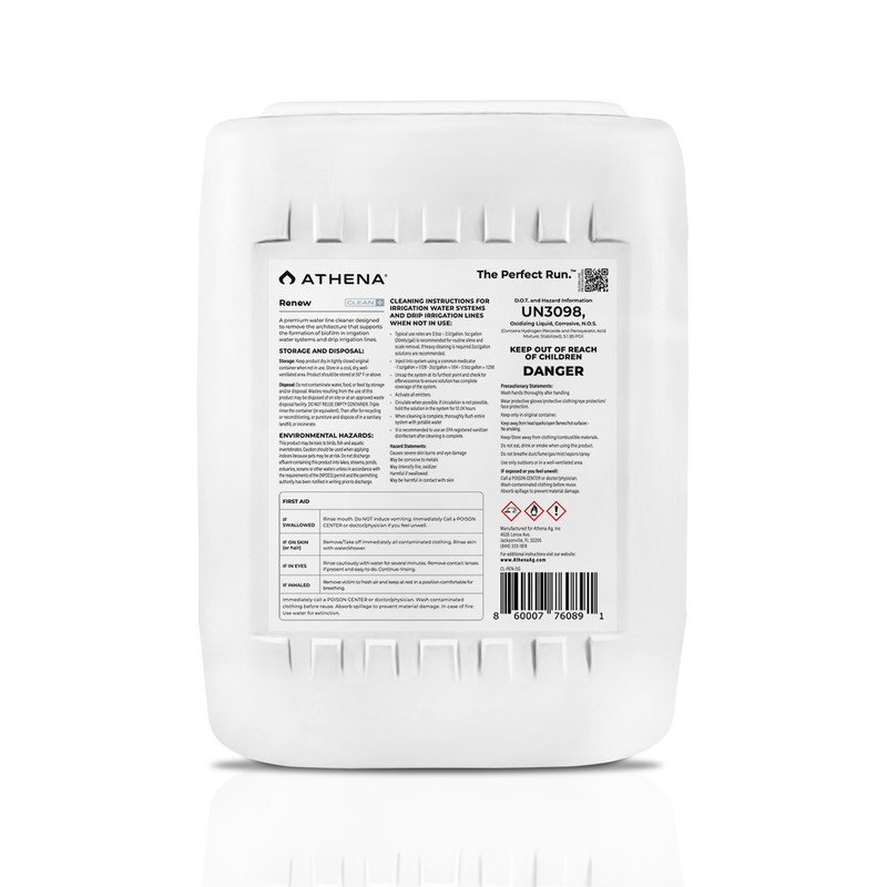 ה - Athena Renew מכיל חומצה אתידרונית (HEDP) שנקשרת לאבנית, למתכות ולמינרלים שמצטברים בצינורות וקווי ההשקיה. מכיל רמות גבוהות של מי חמצן אשר מסיר את הביופילם וכל צבירה של חומר אורגני. השילוב הזה הוא יותר חזק מניקויים המבוססים על חומצה בלבד ומספקים למגדלים פתרון יותר עמיד ומרוכז לתחזוקת מערכות וצינורות ההשקיה.